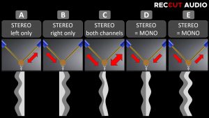 The last two images are produced using the 45/45-type stereophonic recording method, but only reproduce a mono signal. This is because the same signal is applied to both channels. However, in the fourth groove image (D), the electrical signal is applied to both channels in phase, causing both drive rods to move up and down simultaneously, resulting in a depth recording image.