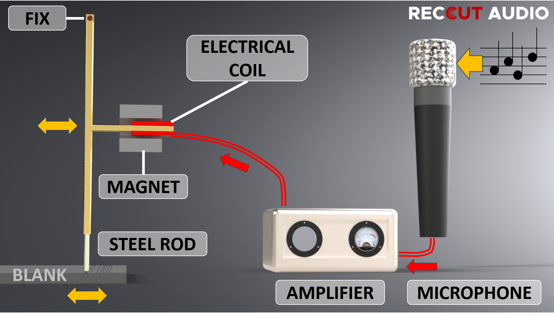 - Cutting stylus: Cuts grooves into the lacquer disc
