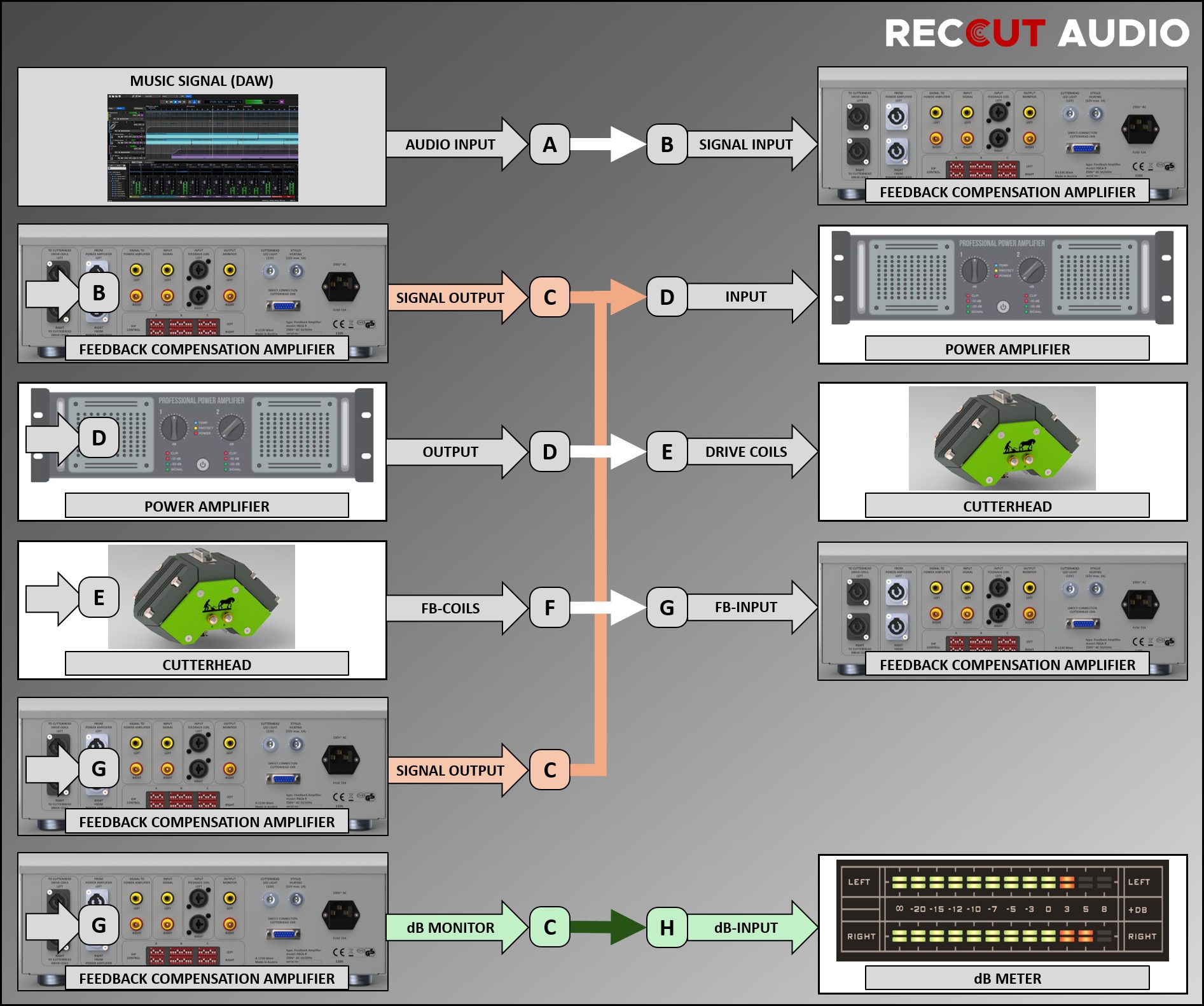 C [Monitor signal output on the feedback amplifier] –> H [Audio signal input on the dB meter]